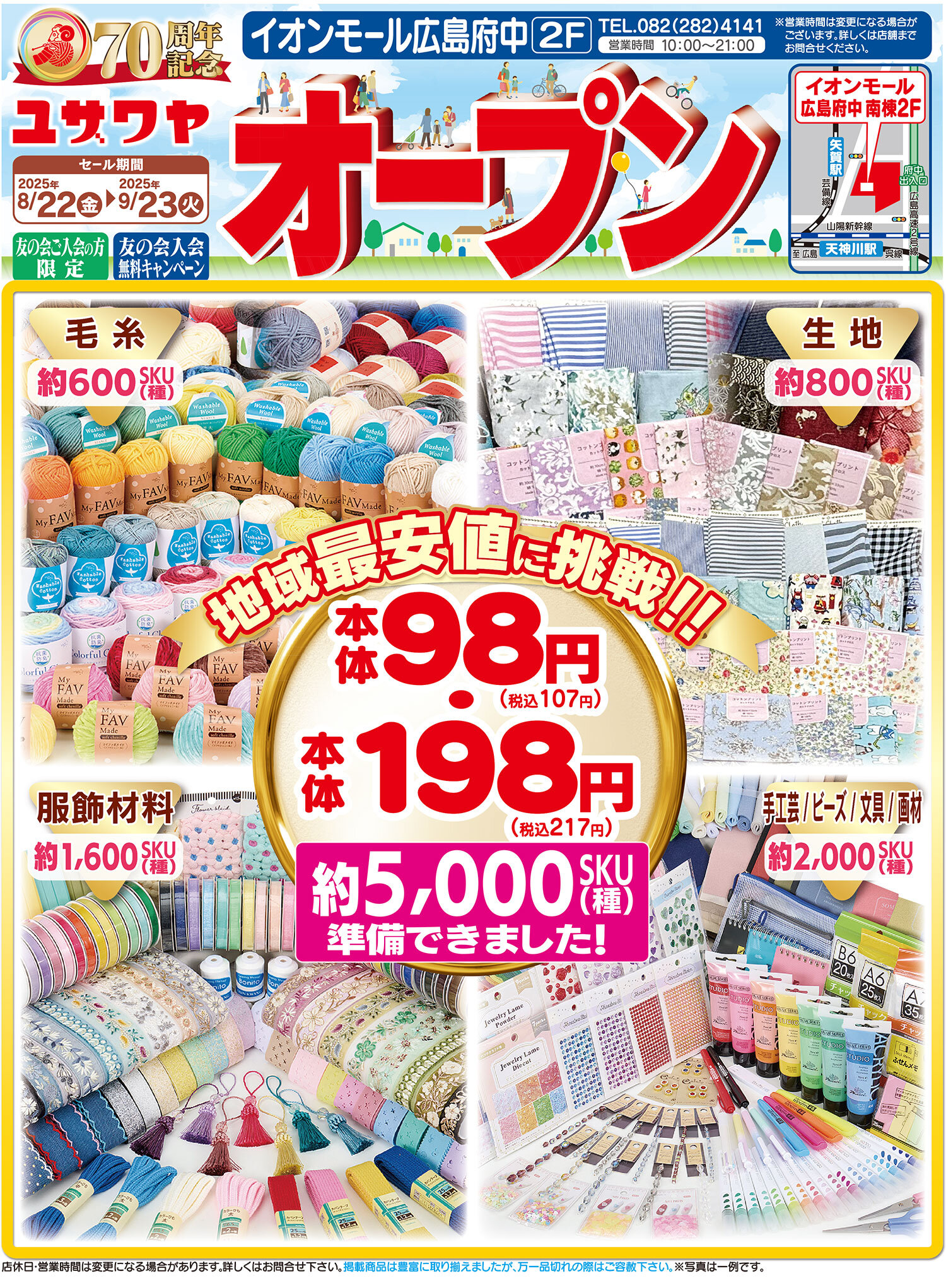 2025年8月22日(金)、イオンモール広島府中 南棟2階にユザワヤがオープン!